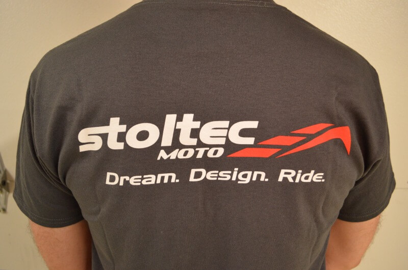 Blended cotton for comfort with a screen printed Stoltec Moto logo on the back and chest.